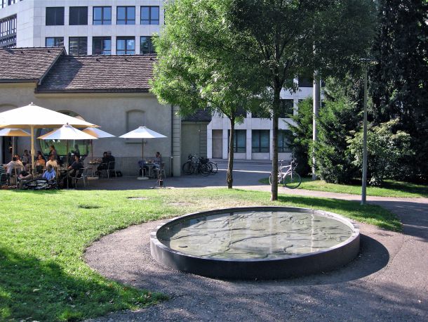 Der Brunnen mit seinem Wurzelrelief nimmt Bezug auf den wertvollen Baumbestand im Park. Das Wasserbecken ist am Wegesrand platziert, in unmittelbare Nähe zur ehemaligen Friedhofskapelle (das ‚Tootehüsli‘) – was inzwischen umgestaltet und als Café mit dem Namen ‚Zum Kuss‘ eingerichtet wurde – und zu den umzäunte Kunstinstallationen ‚Polka‘ und ‚Lander‘ von Erich Steinbrecher.