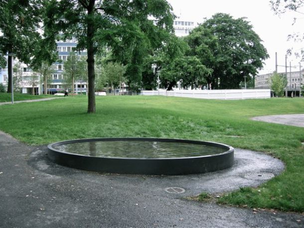 Der Brunnen mit seinem Wurzelrelief nimmt Bezug auf den wertvollen Baumbestand im Park. Das Wasserbecken ist am Wegesrand platziert, in unmittelbare Nähe zur ehemaligen Friedhofskapelle (das ‘Tootehüsli’) – was inzwischen umgestaltet und als Café mit dem Namen ‘Zum Kuss’ eingerichtet wurde – und zu den umzäunte Kunstinstallationen ‘Polka’ und ‘Lander’ von Erich Steinbrecher.
