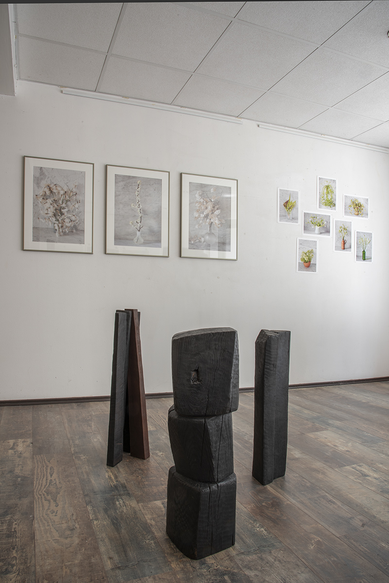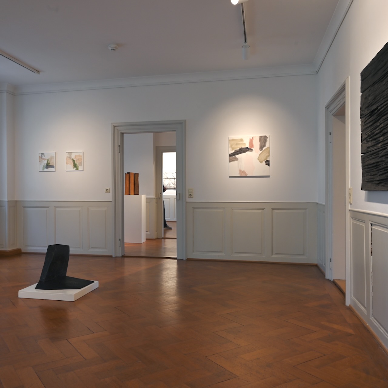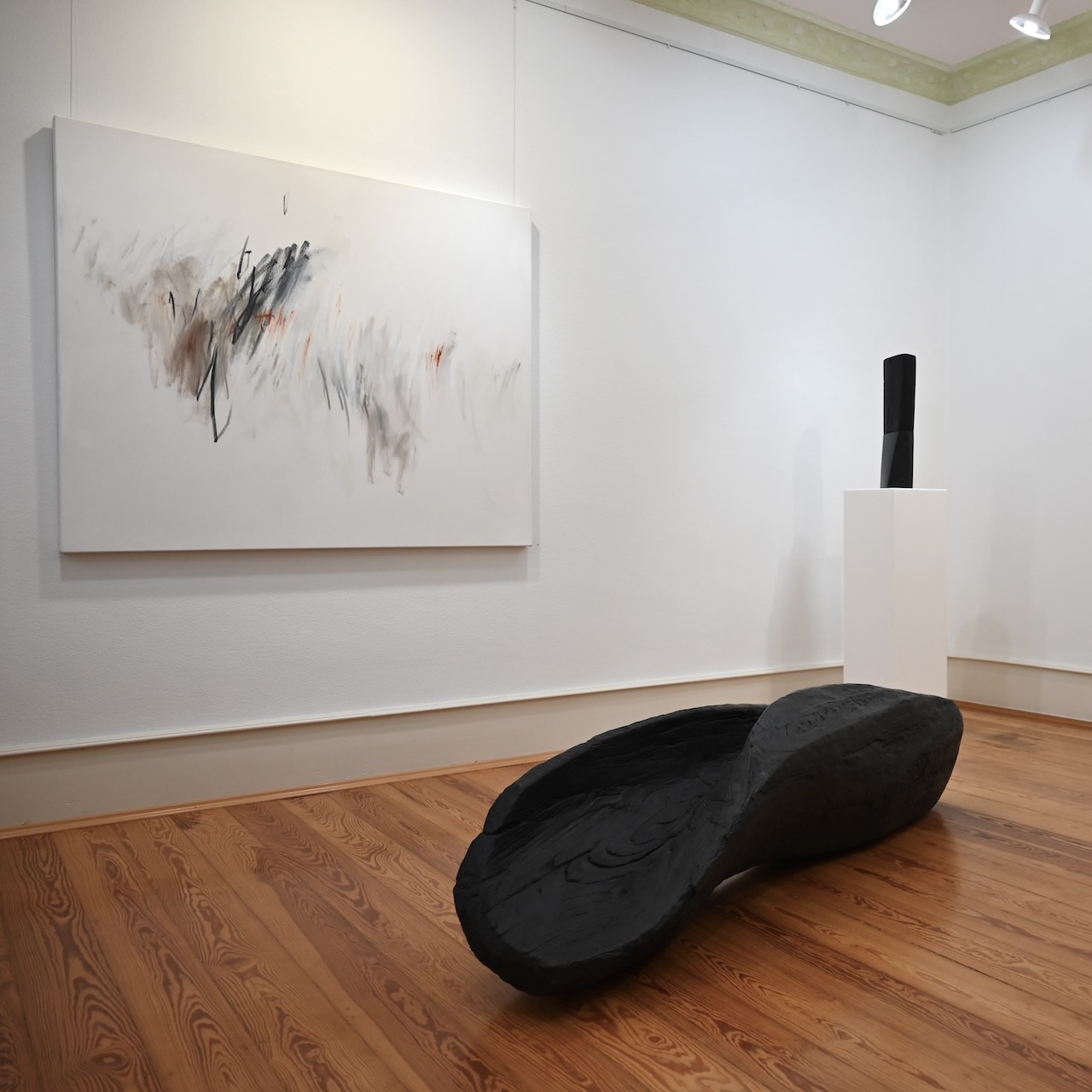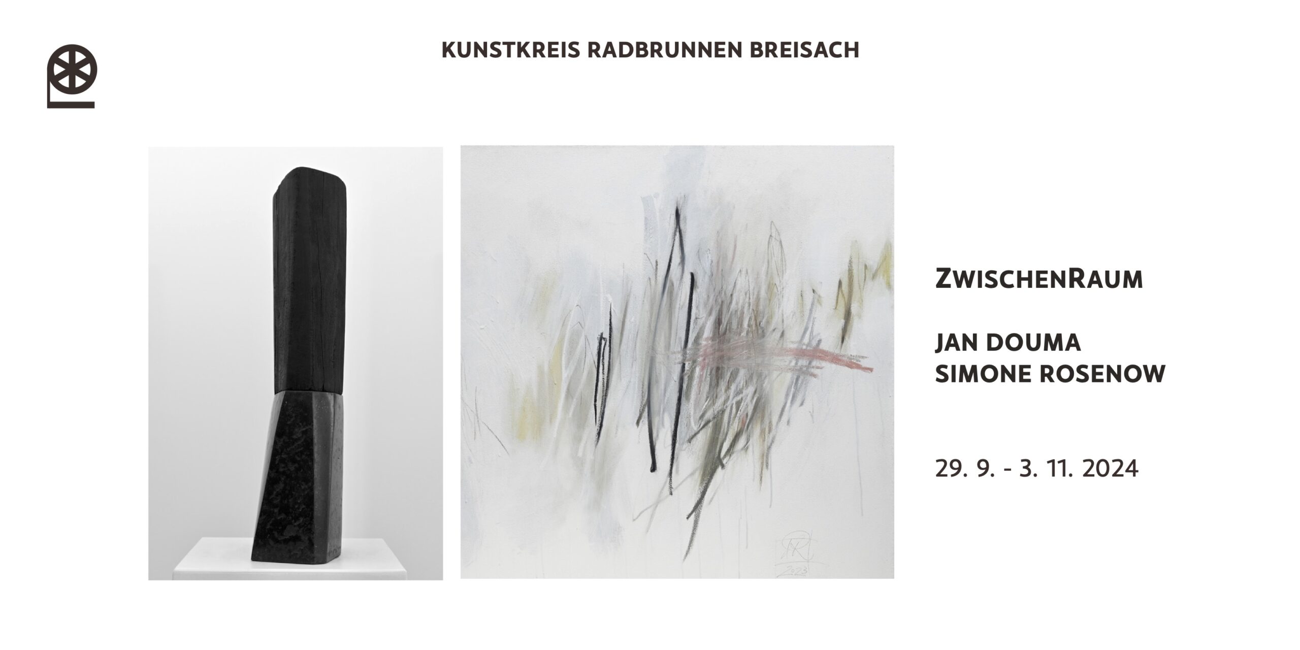 Mit Simone Rosenow und Jan Douma begegnen sich zwei Positionen des nichtgegenständlichen Ausdrucks. Die dynamischen Zeichnungen von Rosenow treffen auf die reduzierten Skulpturen von Douma.Rhythmische Zeichnungen, ob mit Stift oder Pinsel, auf Papier oder Leinwand, auf kleinen oder großen Formaten, prägen die Arbeiten von Rosenow. Immer die Bewegung des Entstehens ablesbar, stehen die Linien zueinander in Korrespondenz. Egal ob zart oder breit aufgetragen, lose nebeneinander, schwebend verteilt, fließend aus- zu- oder gegeneinander, sie wirken wie Klänge im weiten Raum.Die abstrakten Skulpturen von Douma sind gefertigt aus geschwärztem Holz, Stein oder Eisen. Das Material ist unterschiedlich bearbeitet, von fast roh belassen mit nur minimalen Eingriffen versehen bis durchgeformt und fein geschliffen. Die Werke sind zusammengefügt aus mehreren Elementen oder auch aus einem Stück herausgearbeitet. Im Focus stehen die Zwischenbereiche, Übergänge und Bezüge zwischen den Elementen und das Zusammenspiel zwischen Form, Material und Oberfläche. Bewegung trifft auf Ruhe, Leichtigkeit auf Ernst, Enge auf Weite, stehen nebeneinander, gegenüber oder lehnen sich an, stoßen aufeinander, drängen sich, verbinden sich, entfernen sich – Klang trifft Stille.