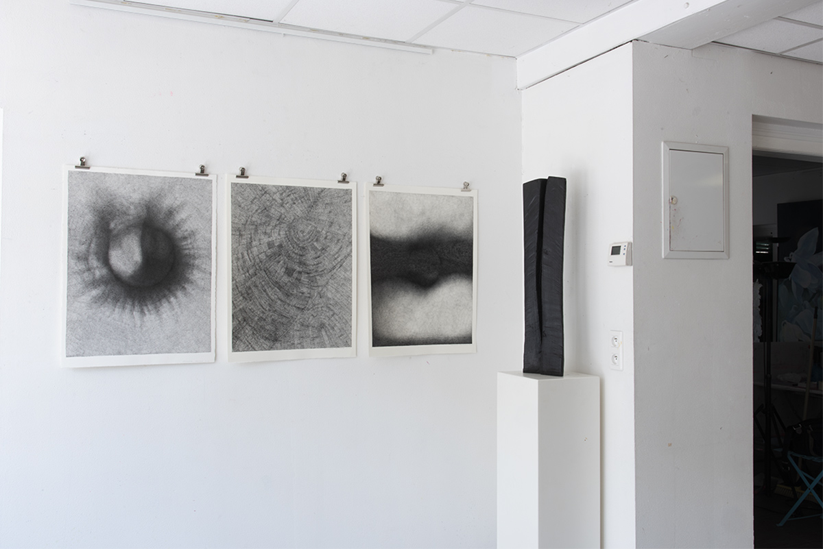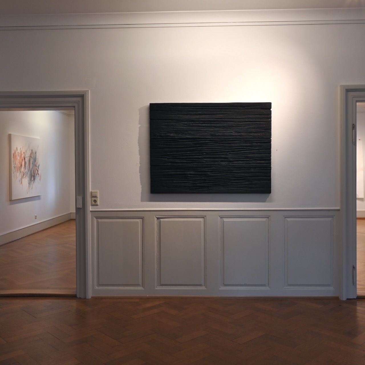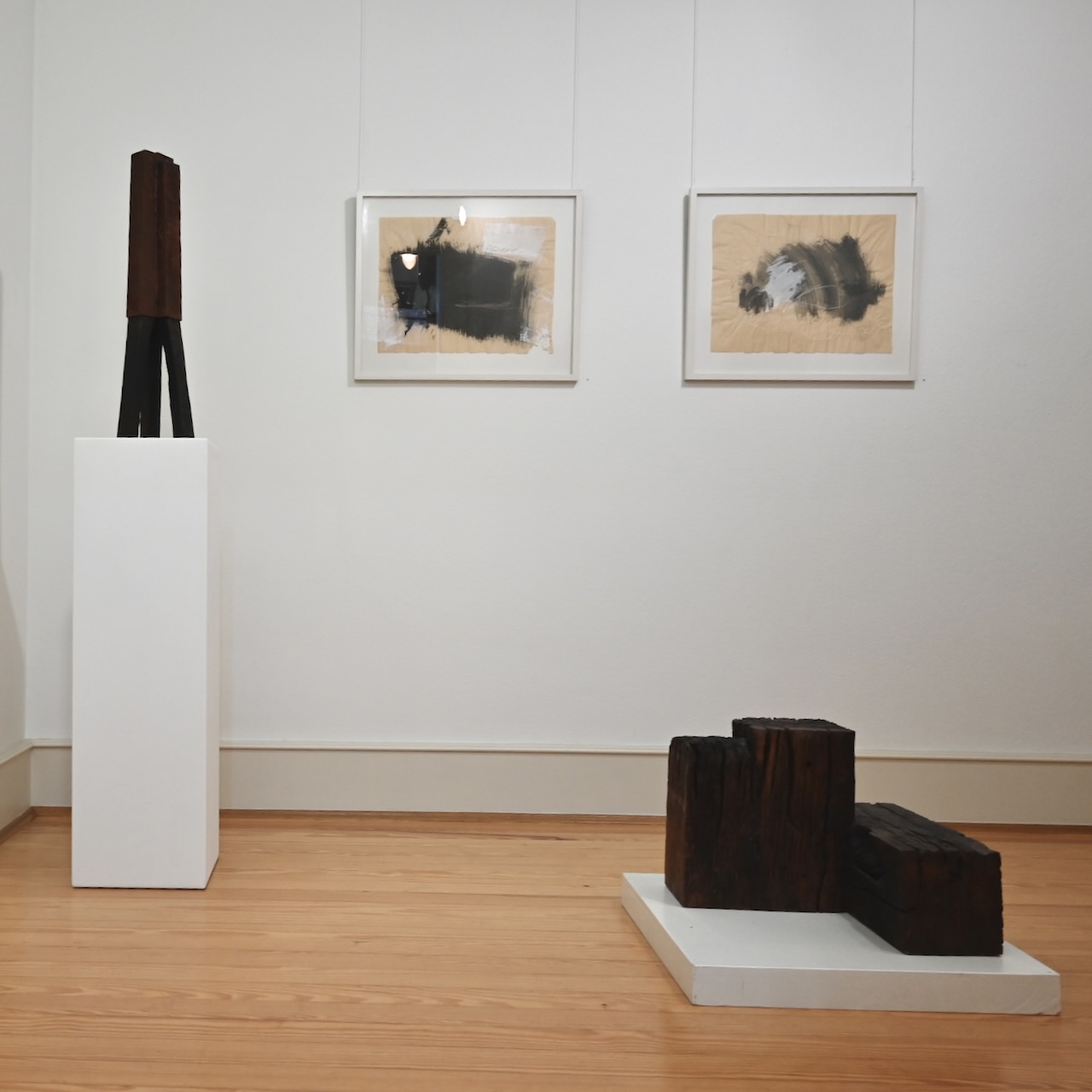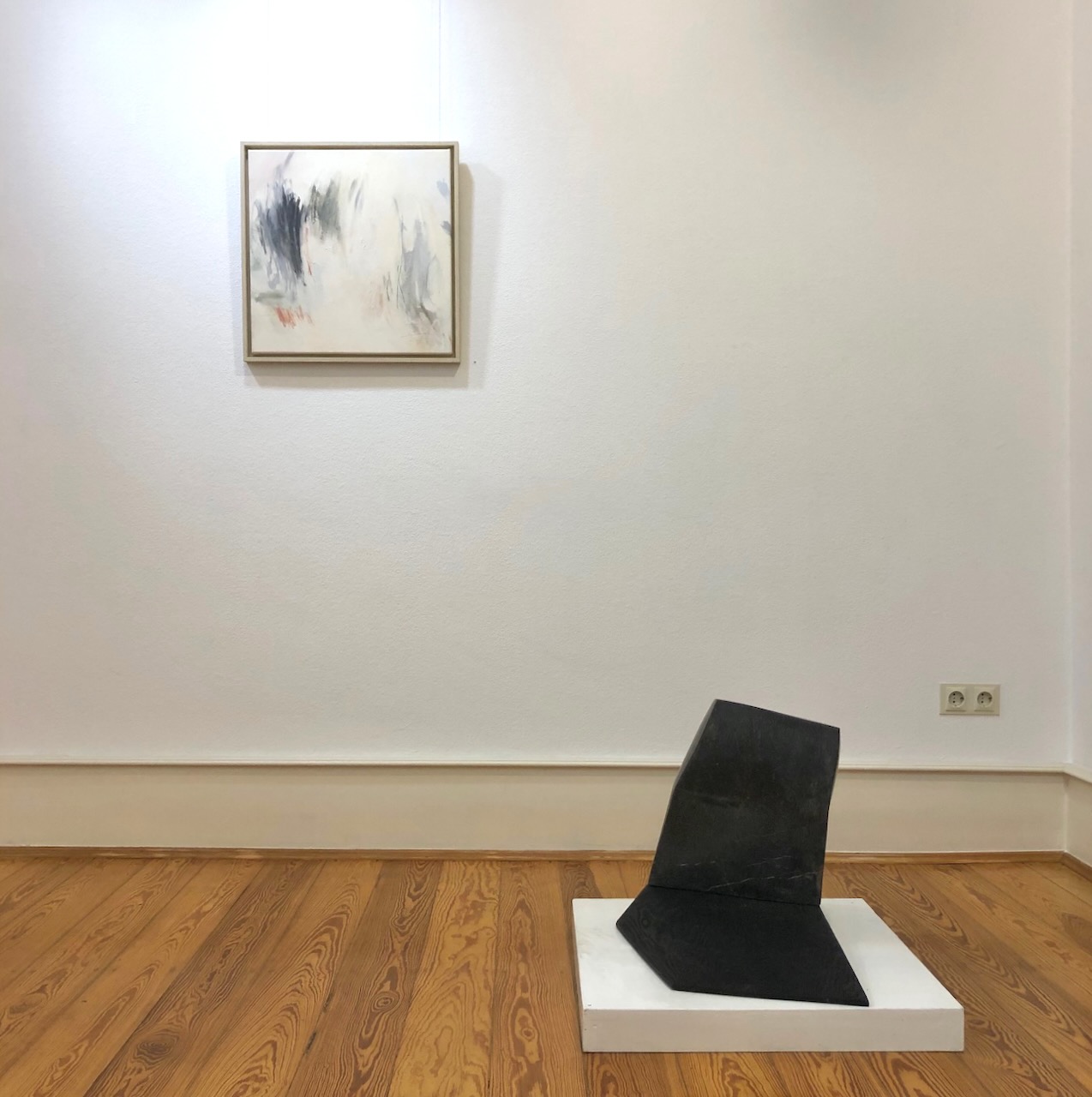 Mit Simone Rosenow und Jan Douma begegnen sich zwei Positionen des nichtgegenständlichen Ausdrucks. Die dynamischen Zeichnungen von Rosenow treffen auf die reduzierten Skulpturen von Douma.Rhythmische Zeichnungen, ob mit Stift oder Pinsel, auf Papier oder Leinwand, auf kleinen oder großen Formaten, prägen die Arbeiten von Rosenow. Immer die Bewegung des Entstehens ablesbar, stehen die Linien zueinander in Korrespondenz. Egal ob zart oder breit aufgetragen, lose nebeneinander, schwebend verteilt, fließend aus- zu- oder gegeneinander, sie wirken wie Klänge im weiten Raum.Die abstrakten Skulpturen von Douma sind gefertigt aus geschwärztem Holz, Stein oder Eisen. Das Material ist unterschiedlich bearbeitet, von fast roh belassen mit nur minimalen Eingriffen versehen bis durchgeformt und fein geschliffen. Die Werke sind zusammengefügt aus mehreren Elementen oder auch aus einem Stück herausgearbeitet. Im Focus stehen die Zwischenbereiche, Übergänge und Bezüge zwischen den Elementen und das Zusammenspiel zwischen Form, Material und Oberfläche. Bewegung trifft auf Ruhe, Leichtigkeit auf Ernst, Enge auf Weite, stehen nebeneinander, gegenüber oder lehnen sich an, stoßen aufeinander, drängen sich, verbinden sich, entfernen sich – Klang trifft Stille.