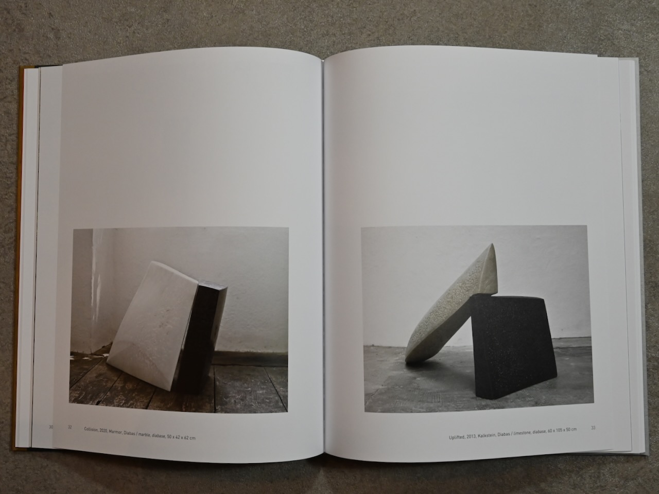 Lehnen, Legen, Stapeln: Der Bildhauer und Maler Jan Douma sucht in seinem äußerst verknapptem Umgang mit dem jeweiligen Material, sei es das der Skulptur oder das der Farbe, nicht in der figürlichen Repräsentation und Abbildbarkeit die Welt, sondern er spürt sie in den Formungen und Formbezügen selbst auf. Häufig ist es eine dualistische Körper- und Raumerfahrung des Dazwischenseins, der Leere oder Instabilität, die sich in der Material- auswahl (Stein, Holz, Beton, Eisen – Öl und Acryl) und Oberflächenbehandlung (geflämmt, grob behauen, farblich nuanciert – vertikal und gestreift) konkretisiert. Fragil berührt sich ein kompakter Granitblock mit einer aufragenden Eichenholzstele an einer winzigen Stelle, zwei säulenartige Betonskulpturen nehmen Fühlung miteinander auf, zungenförmiges ge- masertes Olivenholz ruht partnerschaftlich auf schwarz geflämmter Esche – in der Malerei bahnen sich tief liegende senkrechte Farbschichten ihren Weg nach oben und erzeugen Schwingung und Übergang inmitten einer abstrakten Räumlichkeit.